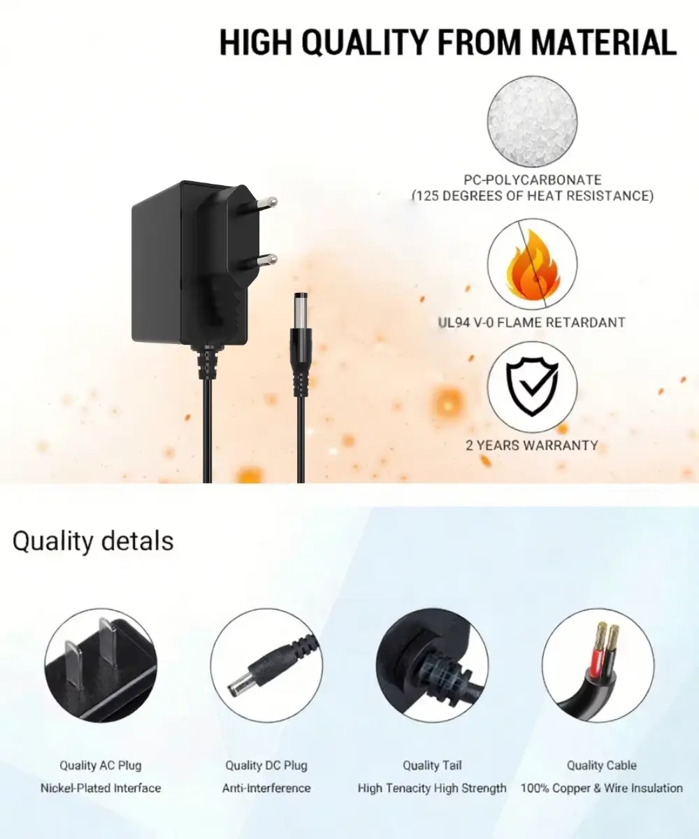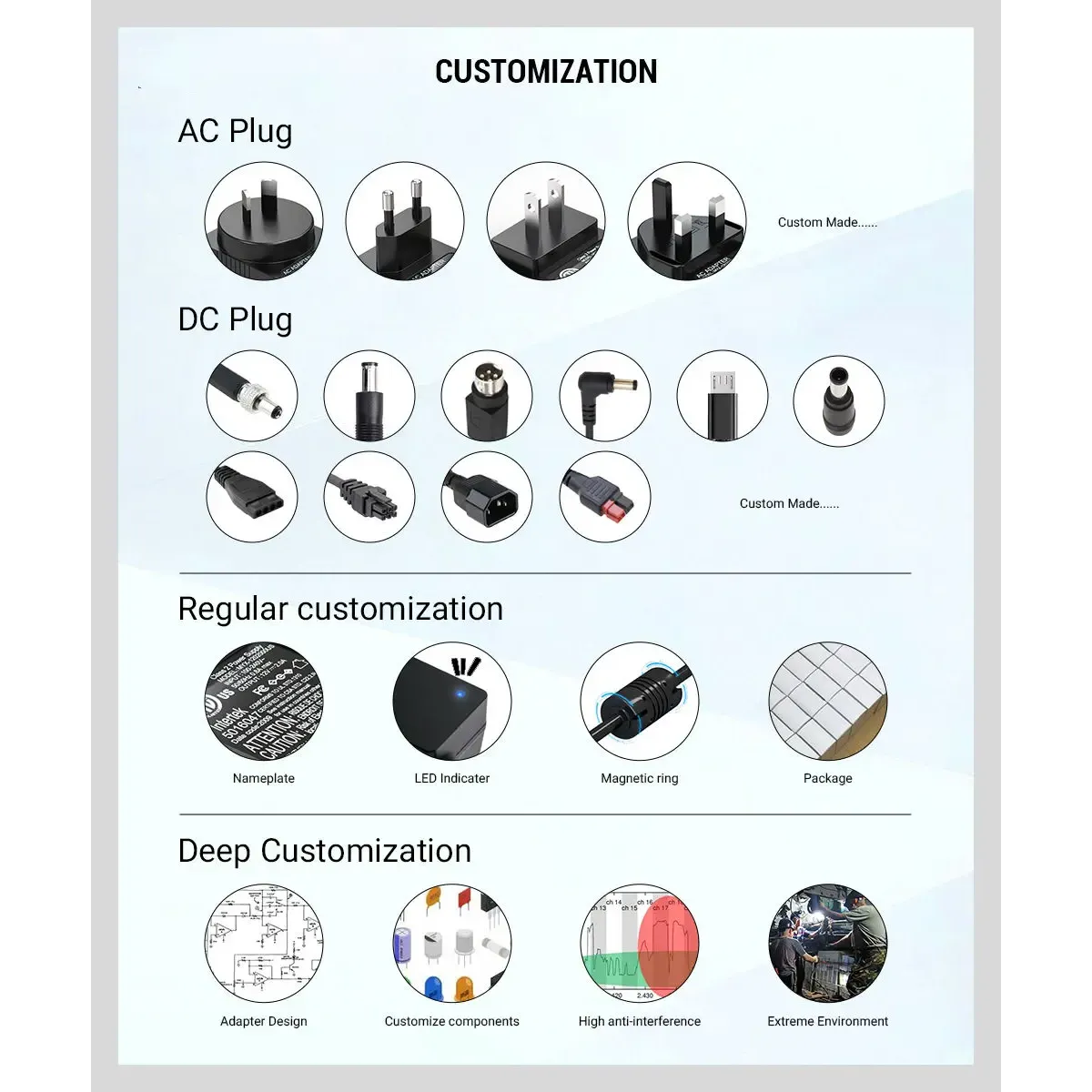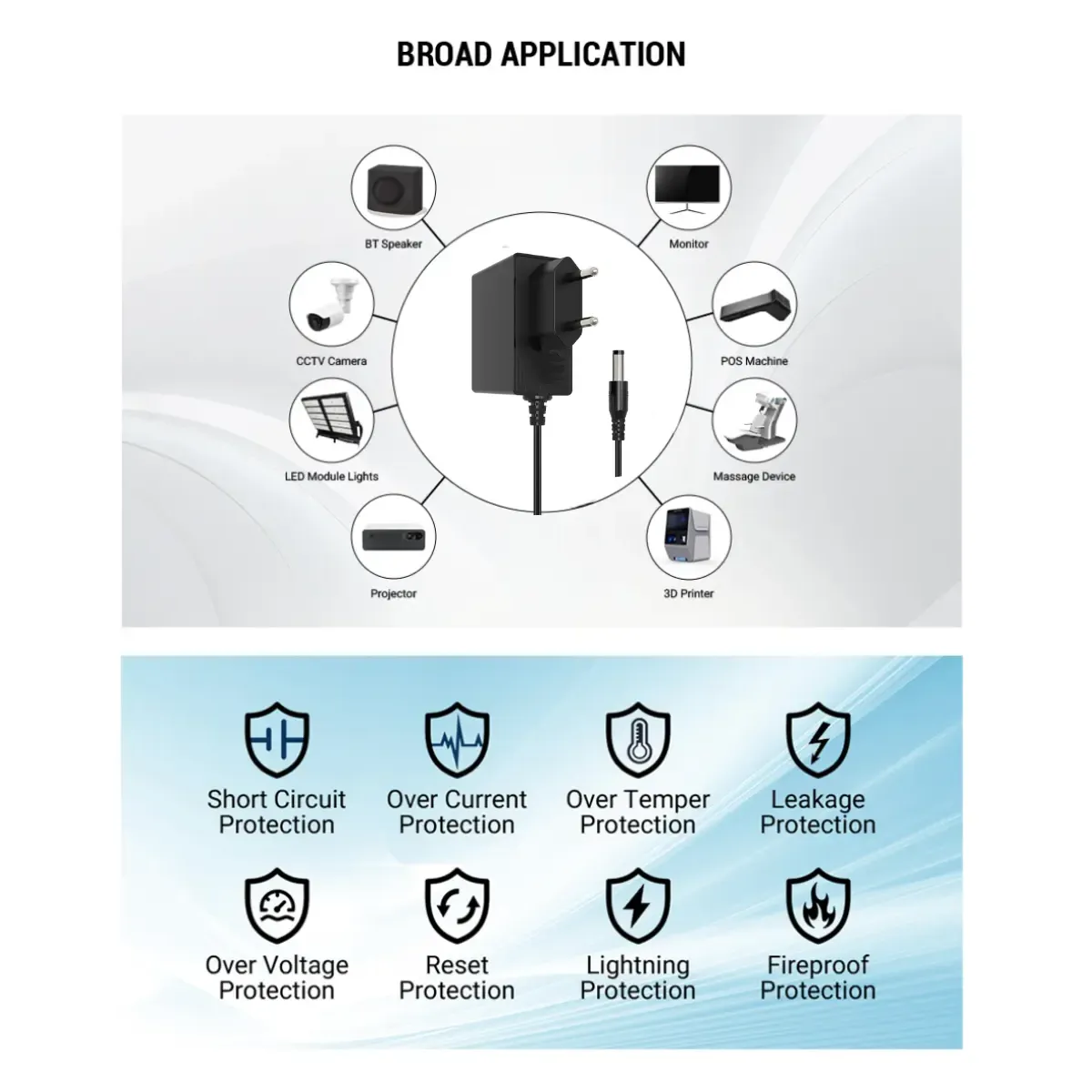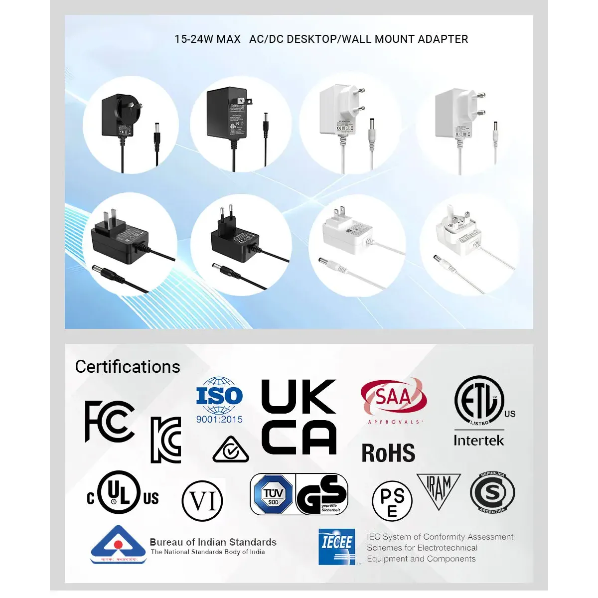 24W güç adaptörü serisi, sıkı uluslararası standartları karşılar ve güvenlik ve çevre uyumluluğunu sağlayan CE/FCC/UL/RCM/SAA/UKCE/KC/BIS/PSE sertifikası dahil olmak üzere küresel sertifikalara sahiptir. Avrupa fiş tasarımı, güvenli bağlantılara olanak tanıyarak çeşitli ortamlarda kullanımı kolaylaştırır.