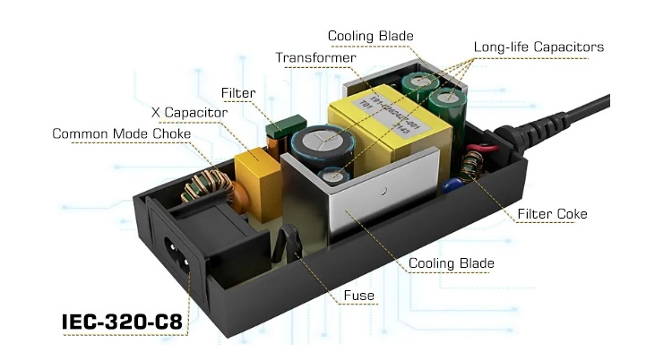 STARWELL 150W masaüstü güç adaptörü, yüksek güçlü cihazlar için profesyonel bir güç çözümü olarak hizmet veren bir IEC C6 standart güç girişi bağlantı noktasına ve 5,5*2,1 mm DC çıkış konektörüne sahiptir. 150W AC/DC güç adaptörünün voltaj çıkış doğruluğu ±%2 kadar yüksektir ve güç dönüşüm verimliliği %90'ı aşar. Güvenliği sağlamak için CE ve FCC sertifikalarını geçti. STARWELL güç adaptörü ofis, eğlence ve ticari senaryolarda cihazlara güç sağlamak için idealdir; orijinal adaptörlere uygun maliyetli bir alternatif veya çoklu cihaz güç ihtiyaçları için bir genişletmedir.