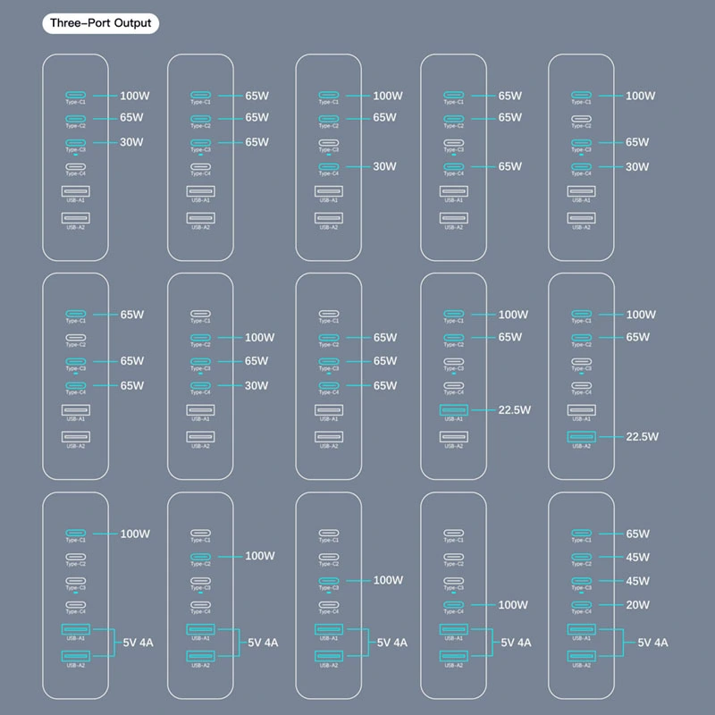 Çıkış USB C1/C2/C3/C4: 5V/3A 9V/3A 12V/3A 15V/3A 20V/5A (Maks. 100W) USB A1/A2: 5V/3A 9V/2A 12V/1,5A (18W Maks.) |