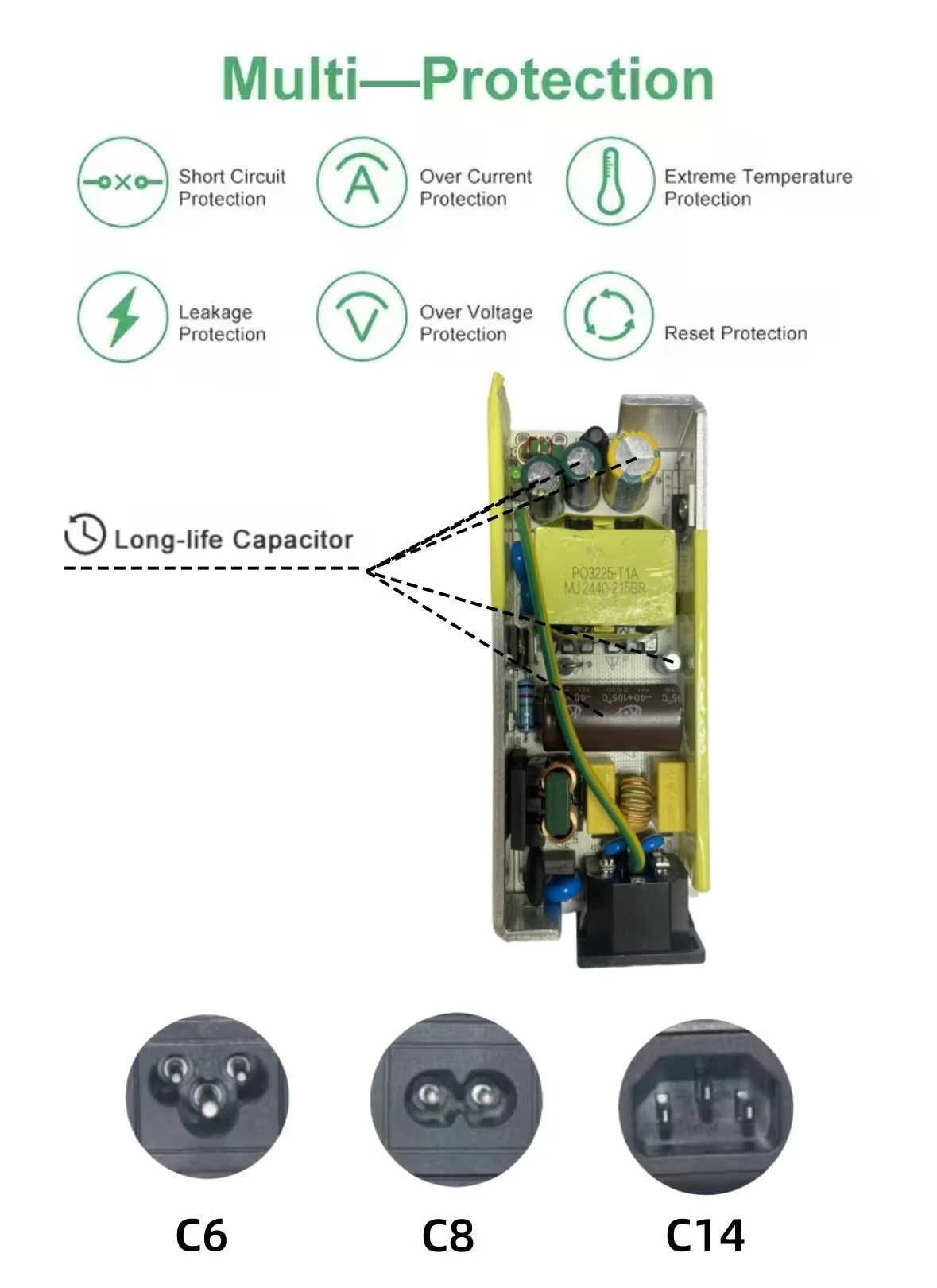 Kapsamlı Güvenlik Korumaları: Aşırı Akım Koruması (OCP), Aşırı Gerilim Koruması (OVP) ve Kısa Devre Korumasını (SCP) içeren entegre korumalar, hem adaptöre hem de değerli ekipmanınıza zarar gelmesini önler.