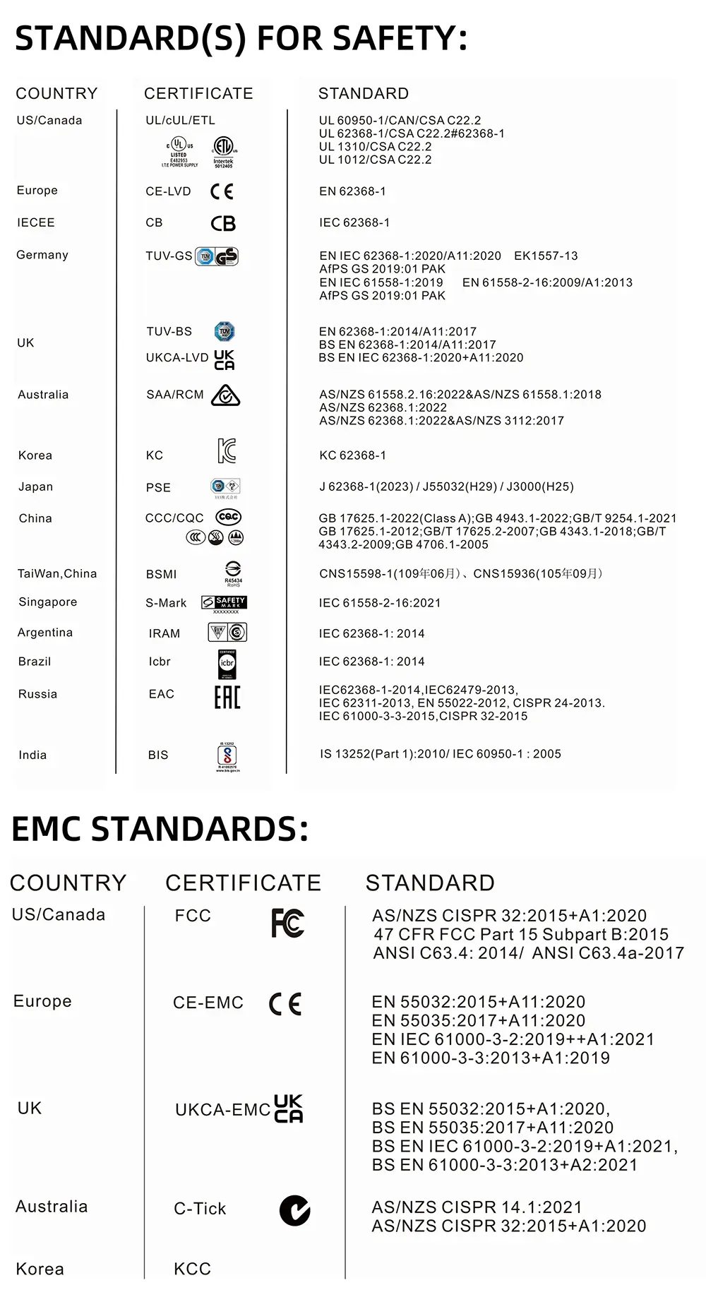 Güvenliğiniz her şeyden önemlidir. Bu adaptör, yalnızca güvenilir performans değil, aynı zamanda gönül rahatlığı da sağlayacak şekilde katı uluslararası standartları karşılayacak şekilde tasarlanmış ve üretilmiştir. Güvenlik, sağlık ve çevre korumayı düzenleyen ETL CE FCC TUV GS CB PSE KC KCC BIS SAA RCM c-Tick CCC UKCA UL cUL RoHS ile uyumludur.