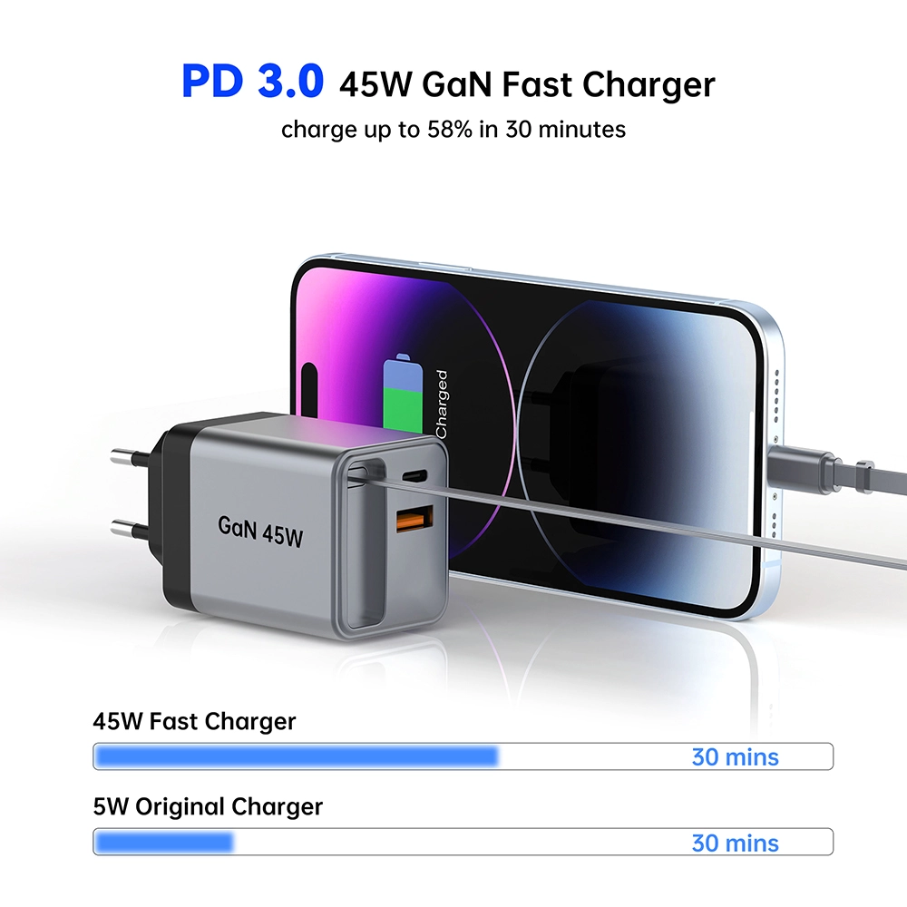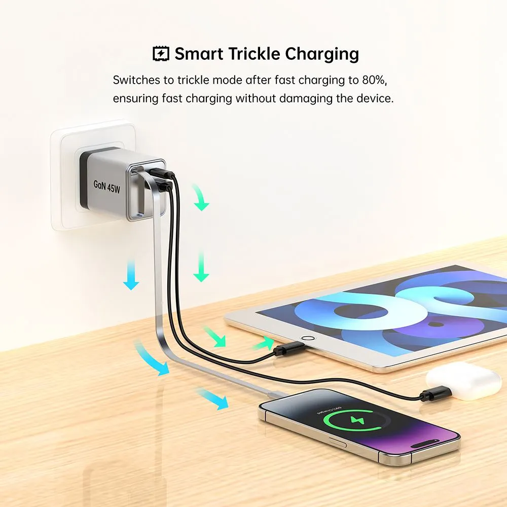 Yüksek Hızlı Şarj: GAN 45W Geri Çekilebilir Hızlı Şarj Cihazı, 45 watt'lık güçlü bir çıkışa sahiptir ve cihazlarınızın hızlı şarj edilmesini sağlar.