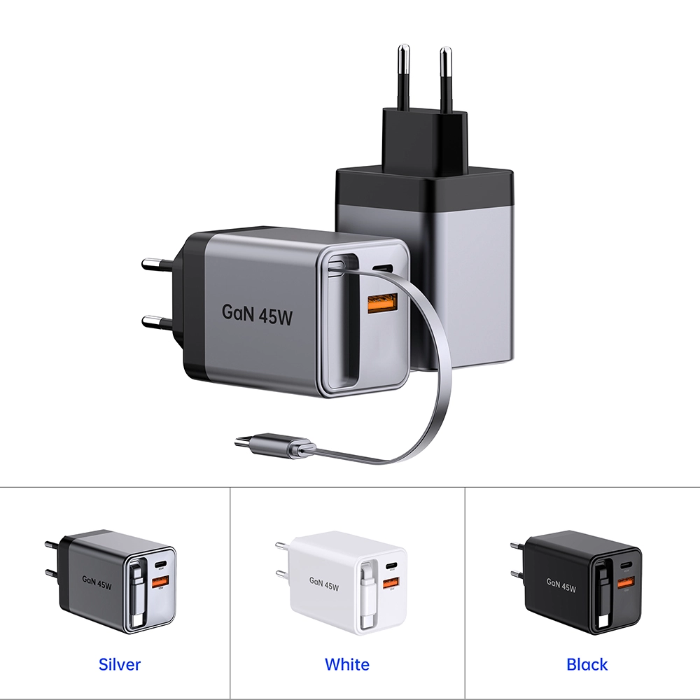 GAN 45W Geri Çekilebilir Hızlı Şarj Cihazı USB-CABLE+USB-A+USB-C Kablolu 45W PD Şarj Cihazı