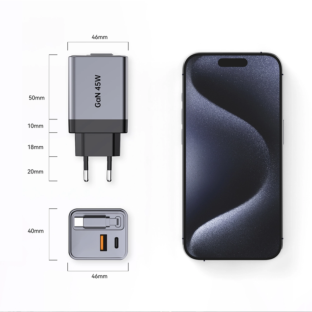 Geri çekilebilir tip c Kablolu 45W AB AC Fişli PD Şarj Cihazı Ürün Açıklaması