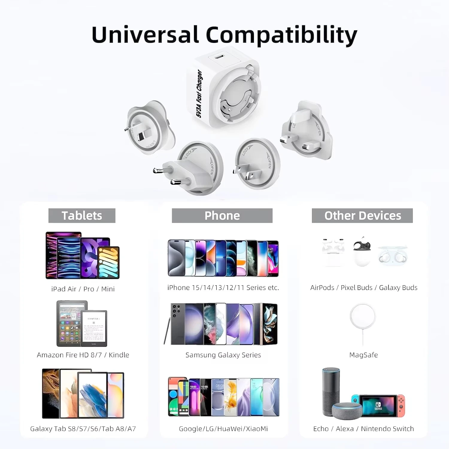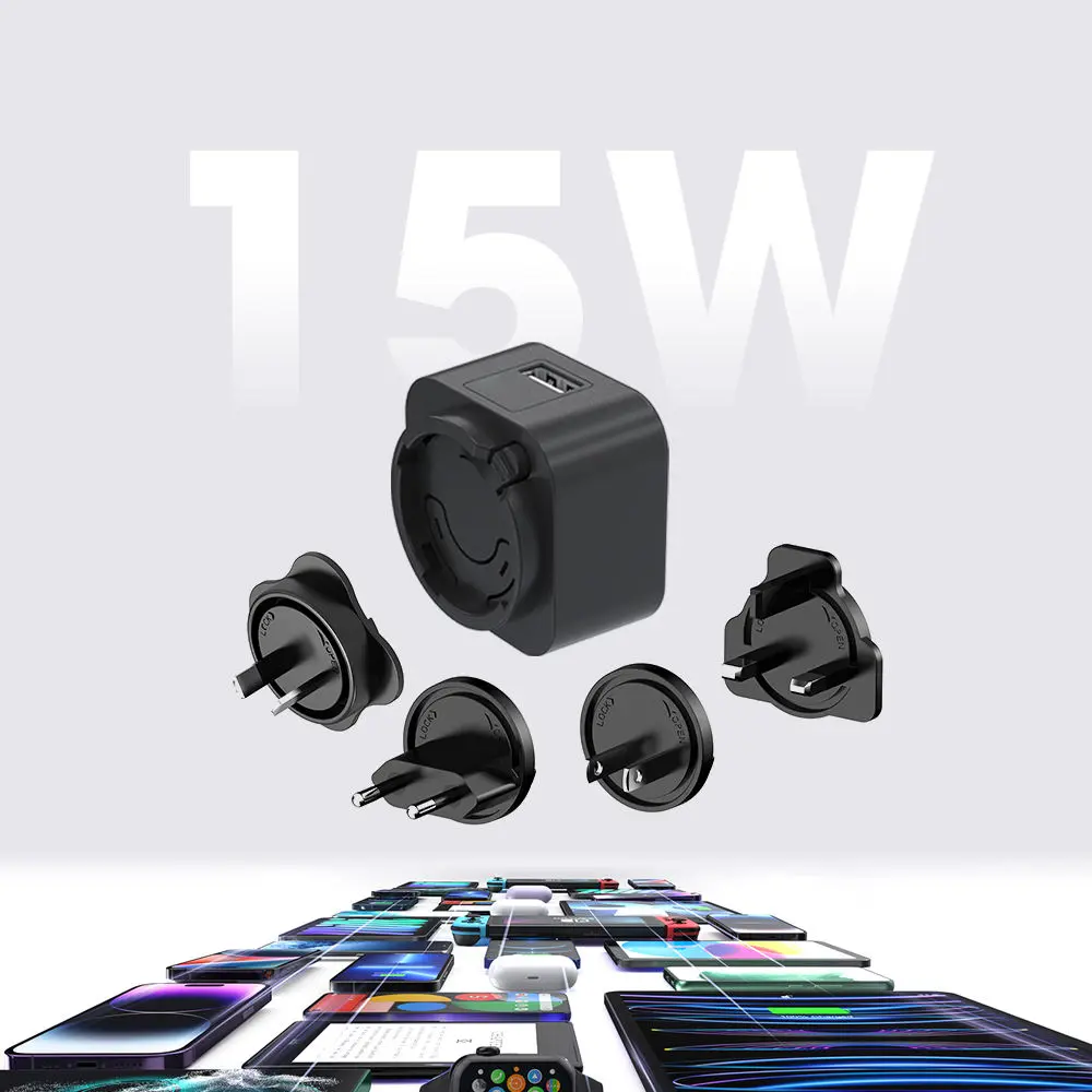 Eksiksiz çıkarılabilir fiş seti (ABD/AB/İngiltere/AU/KR/CN) 150'den fazla ülkede sorunsuz kullanım sağlar; uluslararası seyahat ve günlük kullanım için mükemmeldir.
