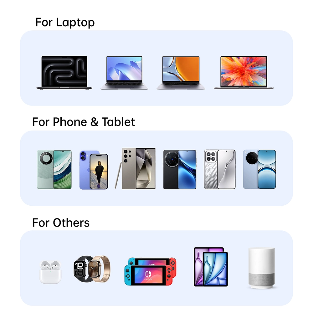 PPS Akıllı Protokolü: Daha geniş uyumluluk ve daha yüksek verimlilik Bu şarj cihazı, yaygın hızlı şarj protokollerini desteklemenin yanı sıra gelişmiş PPS şarj protokolüne de sahiptir. Farklı cihazların şarj gereksinimlerini dinamik olarak eşleştiren daha hassas voltaj ve akım düzenlemesi. Bu, ister Samsung Galaxy serisi telefonları ister en yeni iPhone, Nintendo Switch ve diğer cihazları şarj ediyor olsun, daha verimli ve daha serin bir şarj yöntemi sunabileceği anlamına gelir.